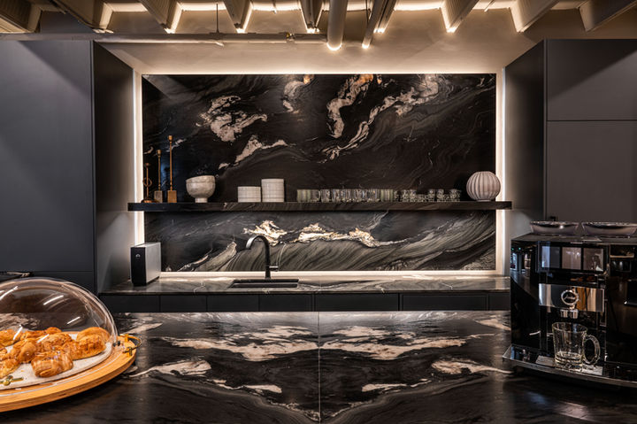 Stonetile Vancouver is an expansion aimed at enhancing operations in the west, designed to evoke an art gallery atmosphere by showcasing wood and tiles on an oversized scale. Upon entering, visitors are welcomed by an elegant coffee station and a lounge area designed for hosting lunch and learn sessions. There are dedicated workstations for architects and designers to unleash their creativity. The displays feature a variety of formats, from wood to tile, while the columns are designed in a pyramid fashion to highlight more materials and add architectural interest. The zigzag walls and displays contribute to the dynamic layout, and the bar-inspired lounge includes all the amenities needed for entertaining, all presented within a stone aesthetic design.